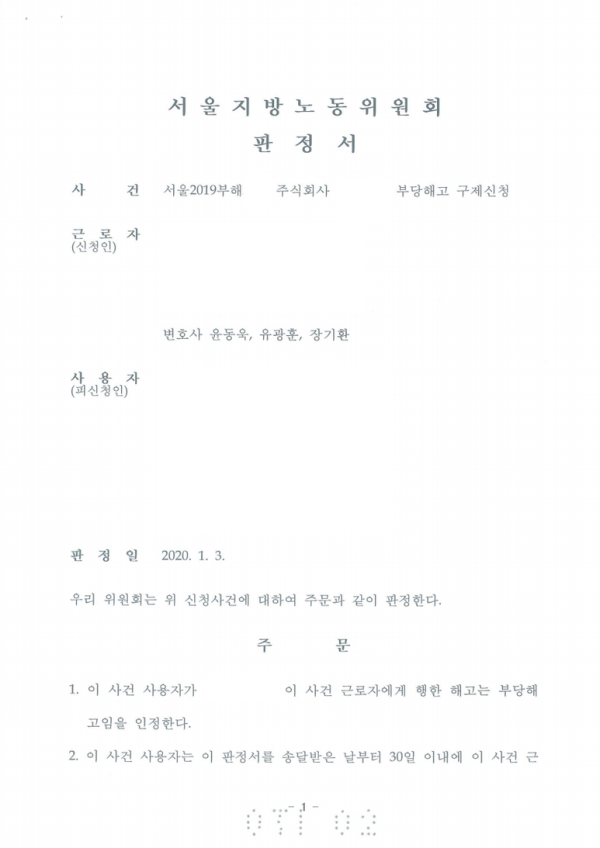 1. 초심(서울지방노동위원회) - 대리하여 전부승소(인용판정)