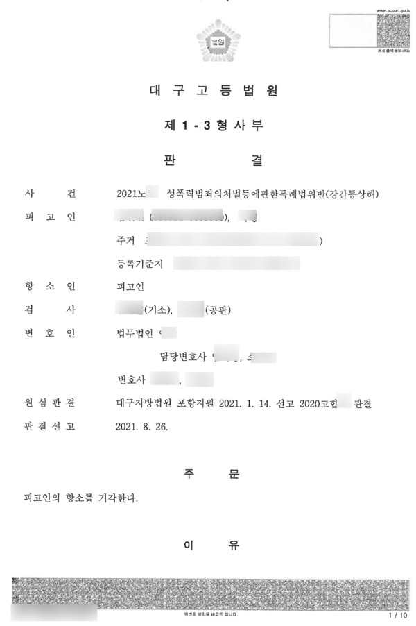 2심 재판부는 공소사실을 모두 인정하고 강간등상해(강제추행으로 상해를 입힘)로 피고인에게 징역5년을 선고하였습니다.