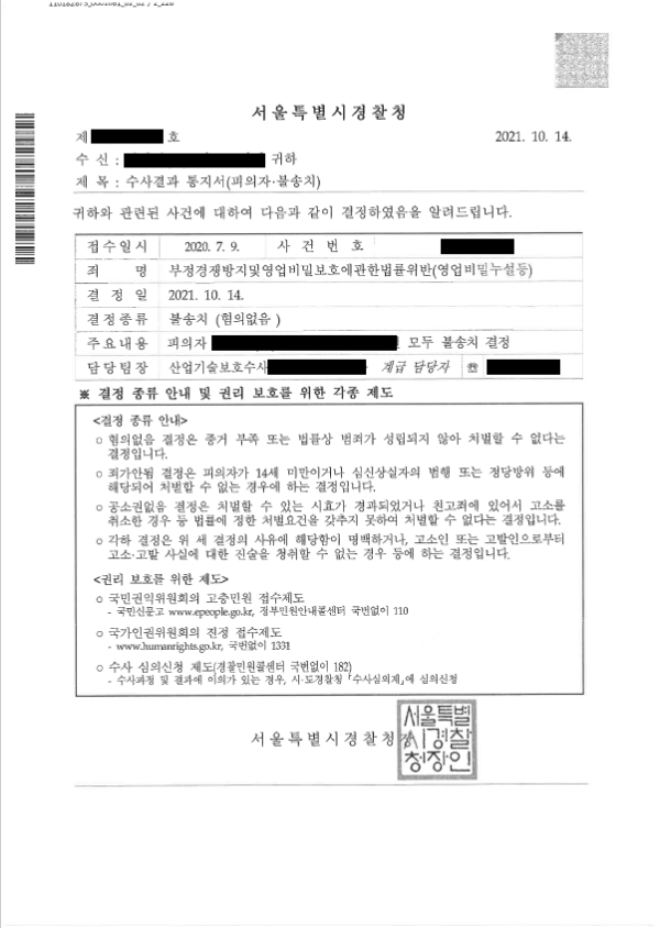주장하면서 서울특별시경찰청 산업기술보호수사대에 부정경쟁방지 및 영업비밀보호에 관한 법률 위반으로 형사 고소한 사례입니다.