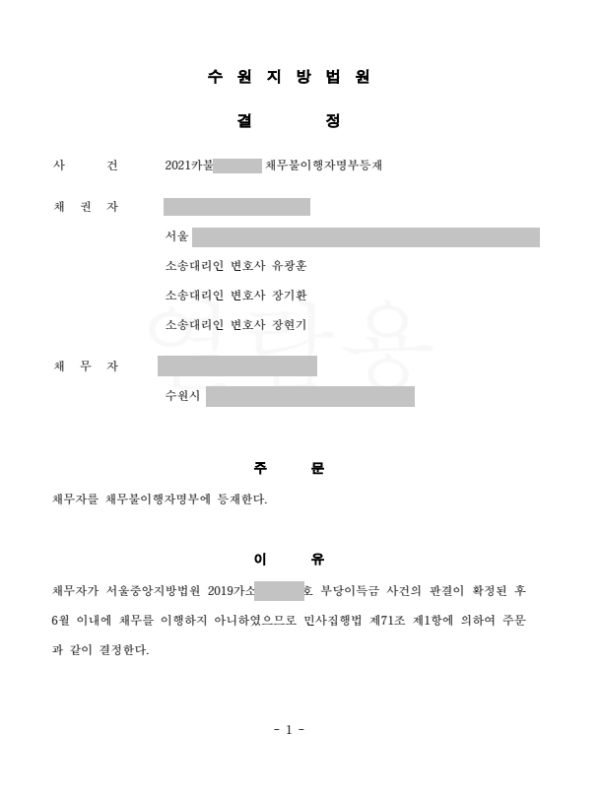 채무가 있음에도 연락을 받지 아니하면서 채무이행을 하지 않는 채무자를 상대로 채무불이행자명부등재신청을 하여 인용결정을 받았습니다.